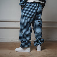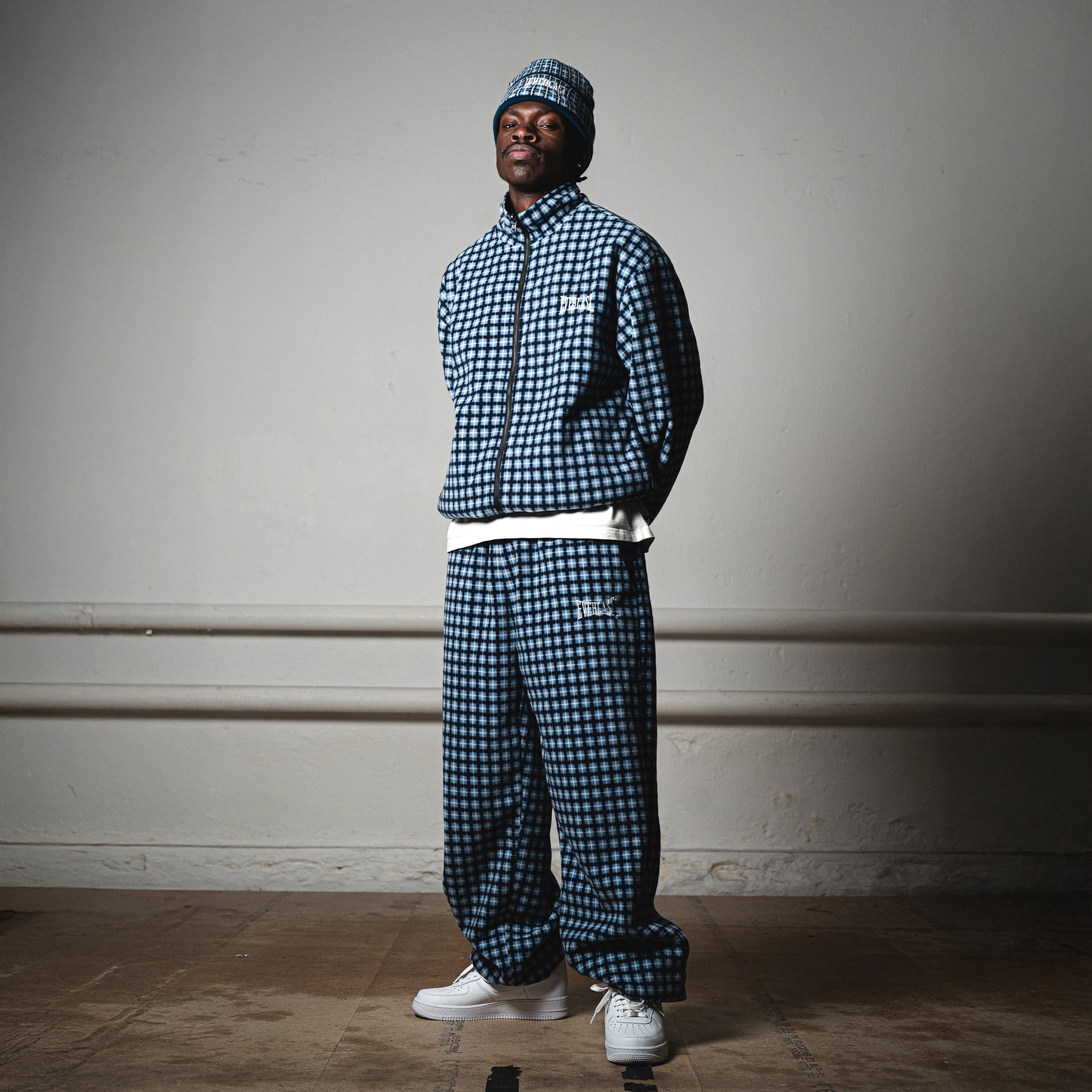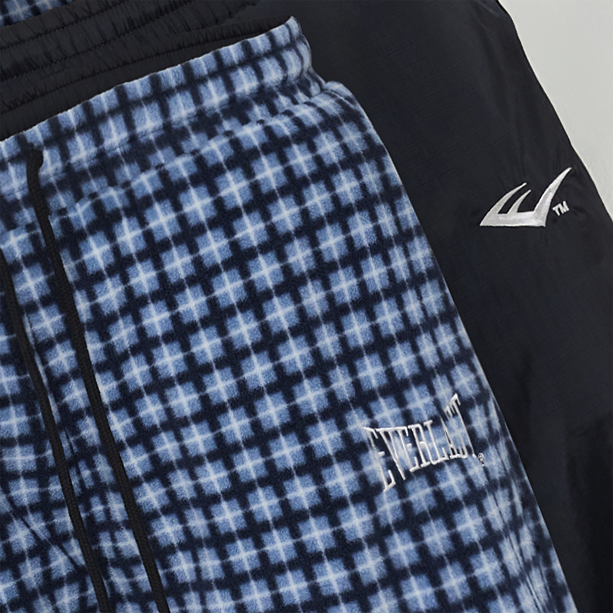 Featuring one side with poly midnight navy shell & reflex linings. The other side features a checkered fleece shell.